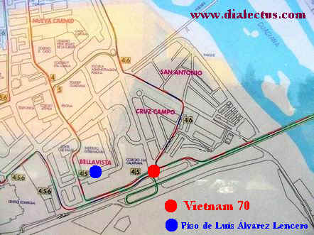 Vista parcial del plano de Mérida. Situación de la escultura Vietnam 70 y del piso donde murió Luis Álvarez Lencero Plano urbano de los autobuses. Mérida