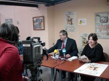 Preparando la rueda de prensa Antonio Viudas Camarasa y Asunción Mieres Royo, fotografiados por Jeremías Clemente Simón, Sede de la Asociación de la Prensa. Cáceres. |